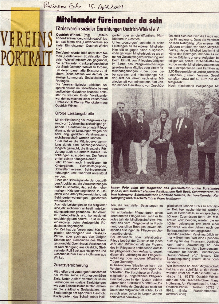 Weiter berichtete er, dass die bereits vorhandene Homepage des FVSE und SSV durch einen Fachmann auf einen aktuellen Stand gebracht wurde, was mit Hilfe des Vorstandes umgesetzt wurde. Beck fordert alle Mitglieder auf, sich diese unter www.pflegezuschuss.de einmal anzuschauen: „Dort sind nun Informationen über die Geschichte des Vereins sowie aktuelle Beschlüsse des Vorstandes nachzulesen“. Weiterhin wurde ein Antrag gestellt, den Aktivpark vom Rheinweg aus zu beschildern, erläuterte er in seinem Jahresbericht. Und er erinnerte daran, dass das gestiftete Roll up zu Werbezwecken in diversen Bankfilialen innerhalb von Oestrich-Winkel sowie im Bürgerzentrum aufgestellt wurde, jedoch leider keine Resonanz in Bezug auf neue Mitglieder zu verzeichnen war.